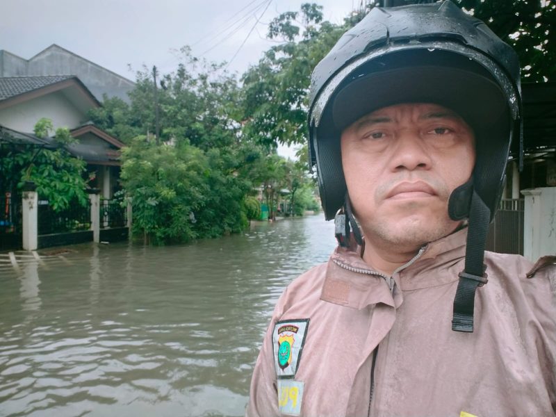 Siaga Banjir, Bhabinkamtibmas Pantau Banjir dan Genangan Air di Wilayah Pekayon Jaya