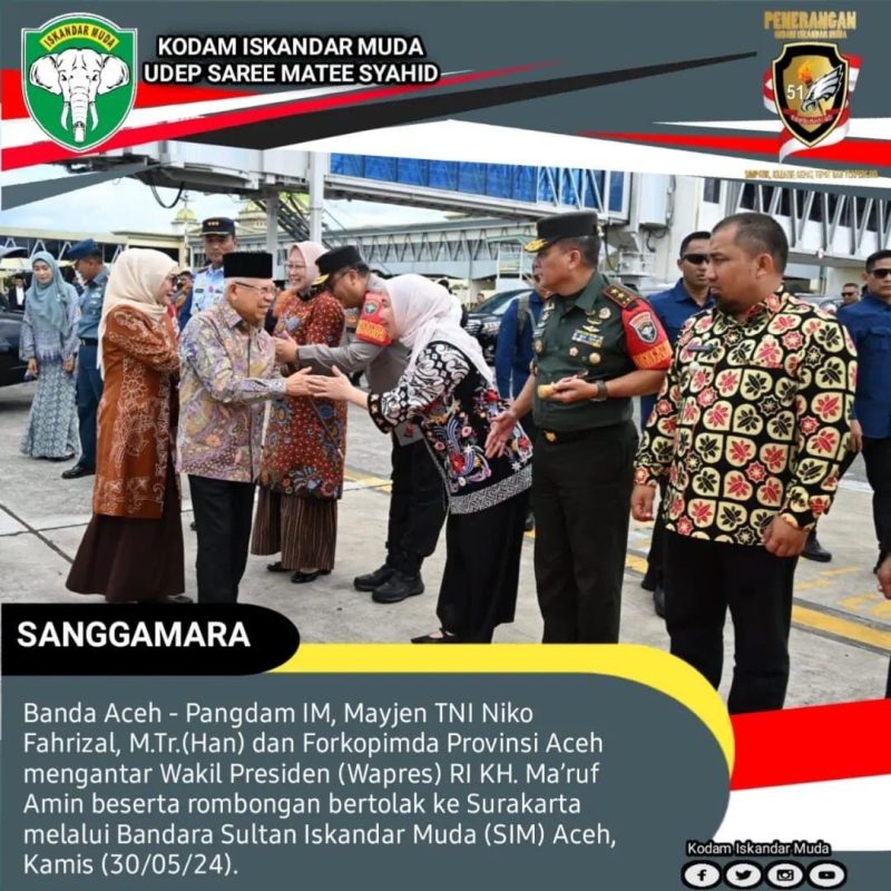 BANDA ACEH – Pangdam IM, Mayjen TNI Niko Fahrizal, M.Tr.(Han) dan Forkopimda Provinsi Aceh mengantar Wakil Presiden (Wapres) RI KH. Ma’ruf Amin beserta rombongan bertolak ke Surakarta melalui Bandara Sultan Iskandar Muda (SIM) Aceh, Kamis (30/05/24).
