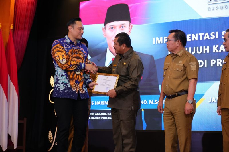 Jambi – Bertempat di Rumah Jabatan Gubernur Jambi, Menteri Agraria dan Tata Ruang/Kepala Badan Pertanahan Nasional (ATR/BPN), Agus Harimurti Yudhoyono (AHY) memberikan penghargaan kepada empat Pemerintah Kabupaten/Kota di Provinsi Jambi pada Selasa (25/06/2024).