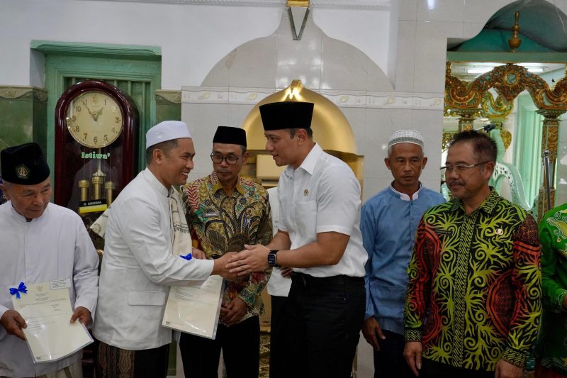 Gresik – Menteri Agraria dan Tata Ruang/Kepala Badan Pertanahan Nasional (ATR/BPN), Agus Harimurti Yudhoyono (AHY) menyerahkan empat sertipikat tanah wakaf di Masjid Besar Ainul Yaqin Sunan Giri, Kabupaten Gresik pada Jumat (05/07/2024). Sertipikat tanah wakaf yang diserahkan kali ini bukan lagi sertipikat analog tapi dalam bentuk Sertipikat Tanah Elektronik.