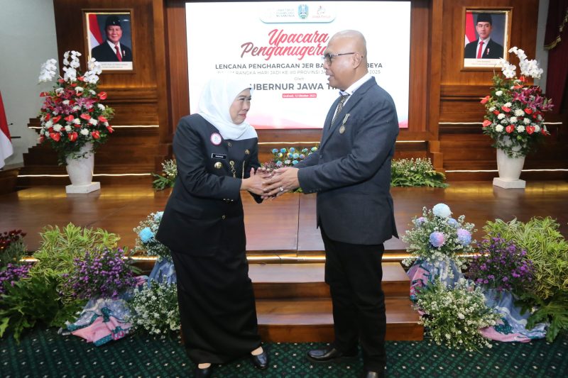 SURABAYA – Ketua Umum Persatuan Wartawan Indonesia (PWI) Pusat, Akhmad Munir, menerima Lencana Kehormatan Provinsi Jawa Timur “Jer Basuki Mawa Beya” dari Gubernur Jawa Timur, pada puncak peringatan Hari Jadi ke-80 Provinsi Jawa Timur, yang digelar di Gedung Negara Grahadi, Surabaya, Minggu (12/10/2025).